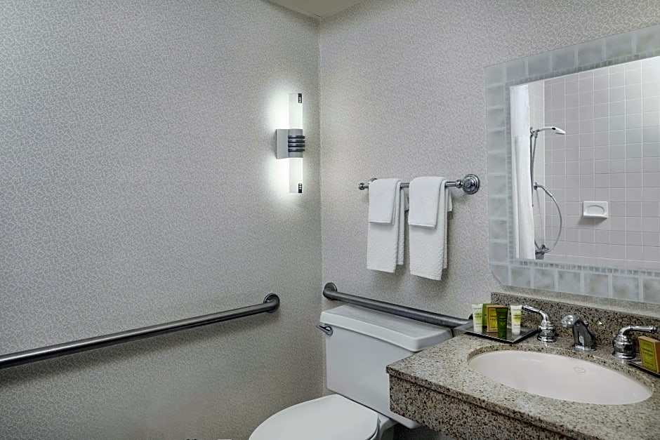 Complimentary breakfast & Evening cocktail Reception, WiFi (complimentary), Lakeview with balcony, separate living area, Coffeemaker This mobility and hearing accessible suite features one king-sized bed. The room also has a visual alarm, and notification devices for door knock and incoming telephone calls. Lake View, two-room suite with balcony, separate living area with sofa bed, wet bar, mini-refrigerator and microwave, and a private bedroom with one king-sized bed, complimentary WiFi access, two-line phones with voicemail. Included are our full cooked-to-order breakfast and our cocktail Evening Reception. The Hilton Serenity Bed includes down duvet, down pillows, deluxe linen program. Refresh in the bathroom with granite vanities a curved shower rod and designer bath amenities. You'll enjoy two flat-screen HDTVs, coffeemaker, iron, ironing board & hairdryer. Any corresponding photo may not reflect the specific accessible room type or room feature.